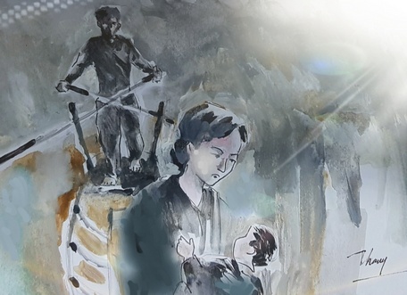 Bé Ba cầm lấy dây xuồng bước lên bờ cột vào gốc cây trứng cá. Tía gác đôi chèo lên xuồng rồi hai tay vịn chặt vào trụ xi măng nhà sàn giữ cho chiếc xuồng được thăng bằng. Má ẵm em bé bước lên nhà thầy Sáu. Vừa thấy, thầy lên tiếng: