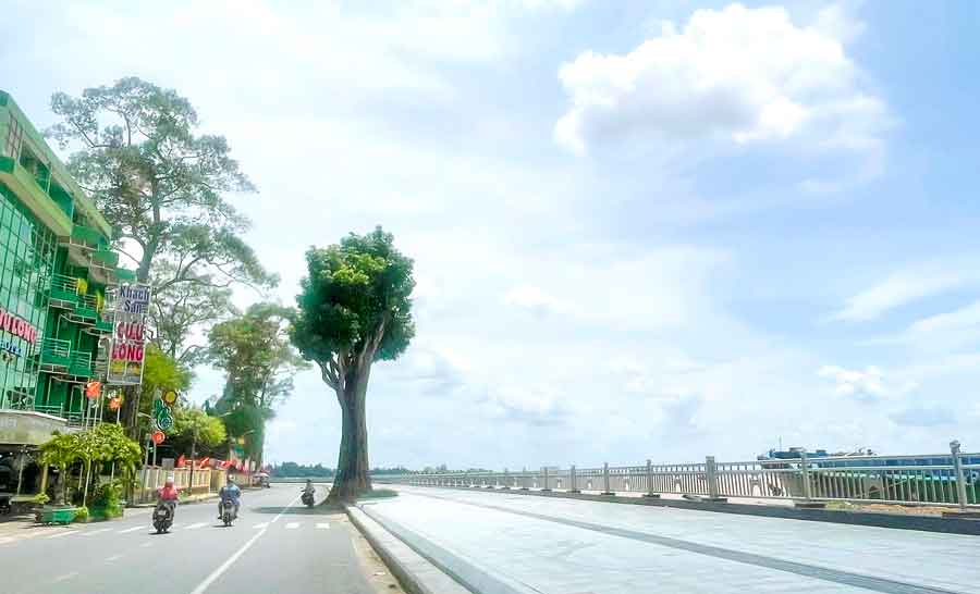 Ngay bên bờ kè sông Cổ Chiên- nơi vốn được xem là điểm nhấn cảnh quan của phường Long Châu- có một cây xanh lớn đứng sừng sững, tỏa bóng mát và tạo nên vẻ đẹp rất riêng cho tuyến đường ven sông.