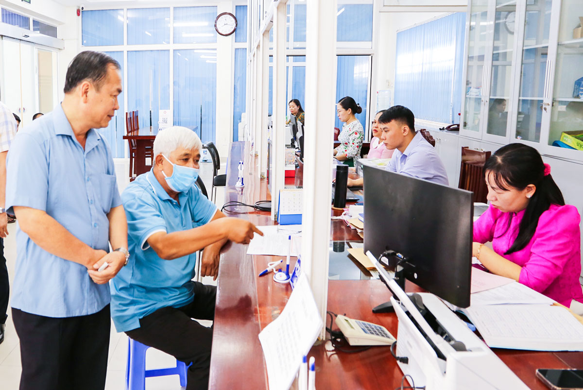 | Phó Chủ nhiệm Ủy ban Kiểm tra Trung ương- Lê Văn Thành; đồng chí Lâm Minh Đằng- Phó Bí thư Tỉnh ủy nắm tình hình hoạt động tại Trung tâm Phục vụ hành chính công phường Nguyệt Hóa. |