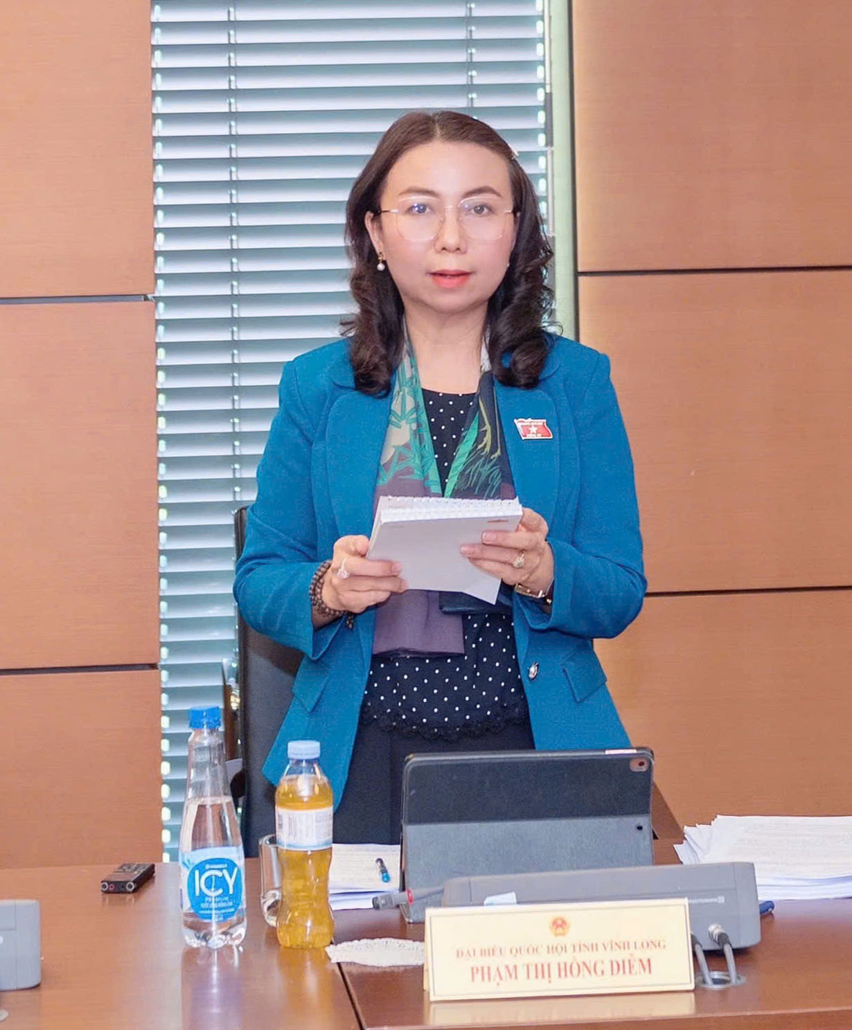 Kỳ họp thứ 10, Quốc hội khóa XV, tại phiên thảo luận tổ, đại biểu Quốc hội Phạm Thị Hồng Diễm- Phó Giám đốc Sở Nội vụ tỉnh Vĩnh Long bày tỏ sự thống nhất đối với Tờ trình của Chính phủ và Báo cáo thẩm tra của Ủy ban Văn hóa và Xã hội của Quốc hội về chủ trương đầu tư Chương trình mục tiêu quốc gia về chăm sóc sức khỏe, dân số và phát triển giai đoạn 2026 - 2035 và chủ trương đầu tư Chương trình mục tiêu quốc gia hiện đại hóa, nâng cao chất lượng giáo dục và đào tạo giai đoạn 2026 - 2035.