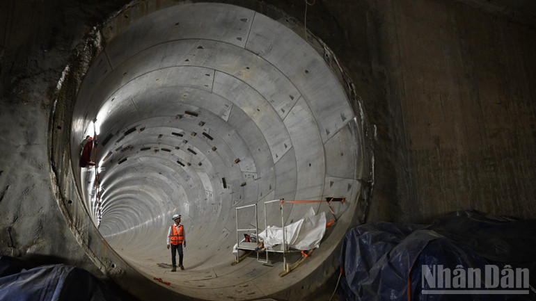 | Kỹ sư đang kiểm tra chất lượng đoạn ống hầm đã thi công tại Ga S11-Văn Miếu. (Ảnh: Trần Hải) |