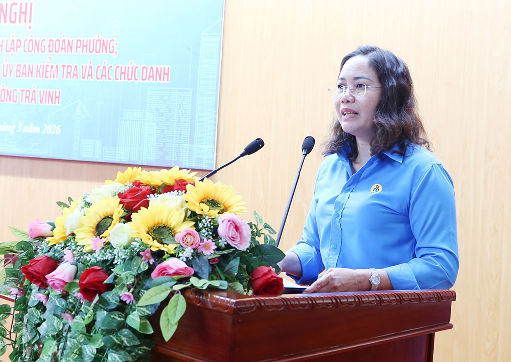 Công đoàn phường Trà Vinh được thành lập từ ngày 24/3/2026 theo Quyết định số 100/QĐ-LĐLĐ, ngày 18/3/2026 của LĐLĐ tỉnh, có 2.074 đoàn viên thuộc 28 công đoàn cơ sở. LĐLĐ tỉnh chỉ định BCH Công đoàn phường Trà Vinh có 9 đồng chí, Ủy ban Kiểm tra Công đoàn phường có 3 đồng chí, chỉ định đồng chí Lê Thúy Kiều làm Chủ tịch Công đoàn phường.