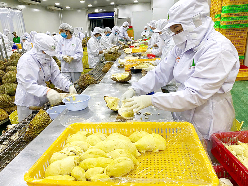 Đóng gói sầu riêng đông lạnh xuất khẩu tại Công ty cổ phần Tập đoàn XNK Trái cây Chánh Thu. Ảnh: Cẩm Trúc |