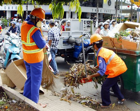 | Công nhân vệ sinh tất bật dọn dẹp đường phố để đón giao thừa.