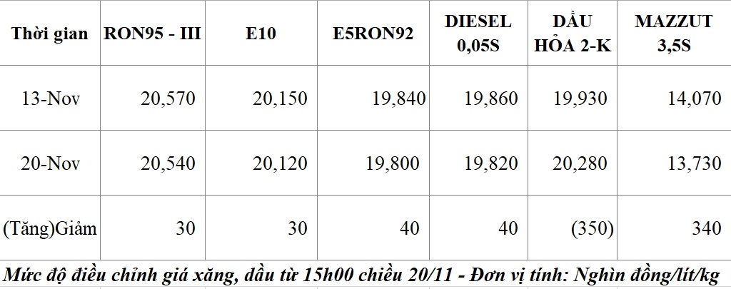 Trong kỳ điều hành ngày 20/11, giá xăng RON95-III giảm 30 đồng/lít; giá xăng E5RON92 giảm 40 đồng/lít, giá xăng E10 giảm 30 đồng/lít, cùng lúc giá dầu diesel giảm 40 đồng/lít; dầu hỏa tăng 350 đồng/lít, mặt hàng dầu mazut kỳ này lại giảm 340 đồng/lít so với kỳ điều chỉnh ngày 13/11.