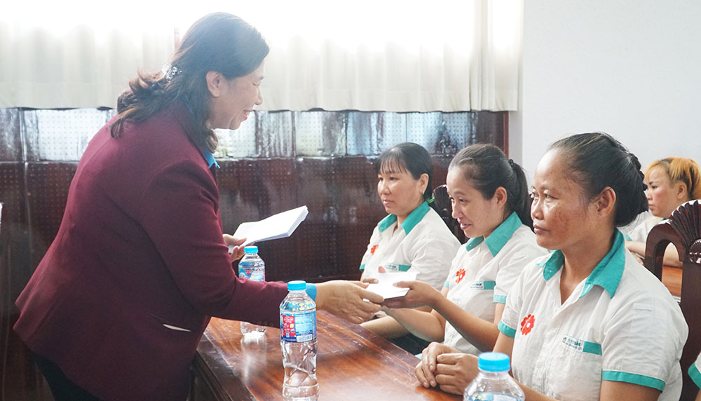 | Phó Chủ tịch Thường trực Liên đoàn Lao động tỉnh- Lê Thị Kim Chi và Ủy viên Ban Thường vụ Liên đoàn Lao động tỉnh- Lê Nguyễn Lan Anh trao quà cho nữ đoàn viên, người lao động, tại xã Long Hồ. |