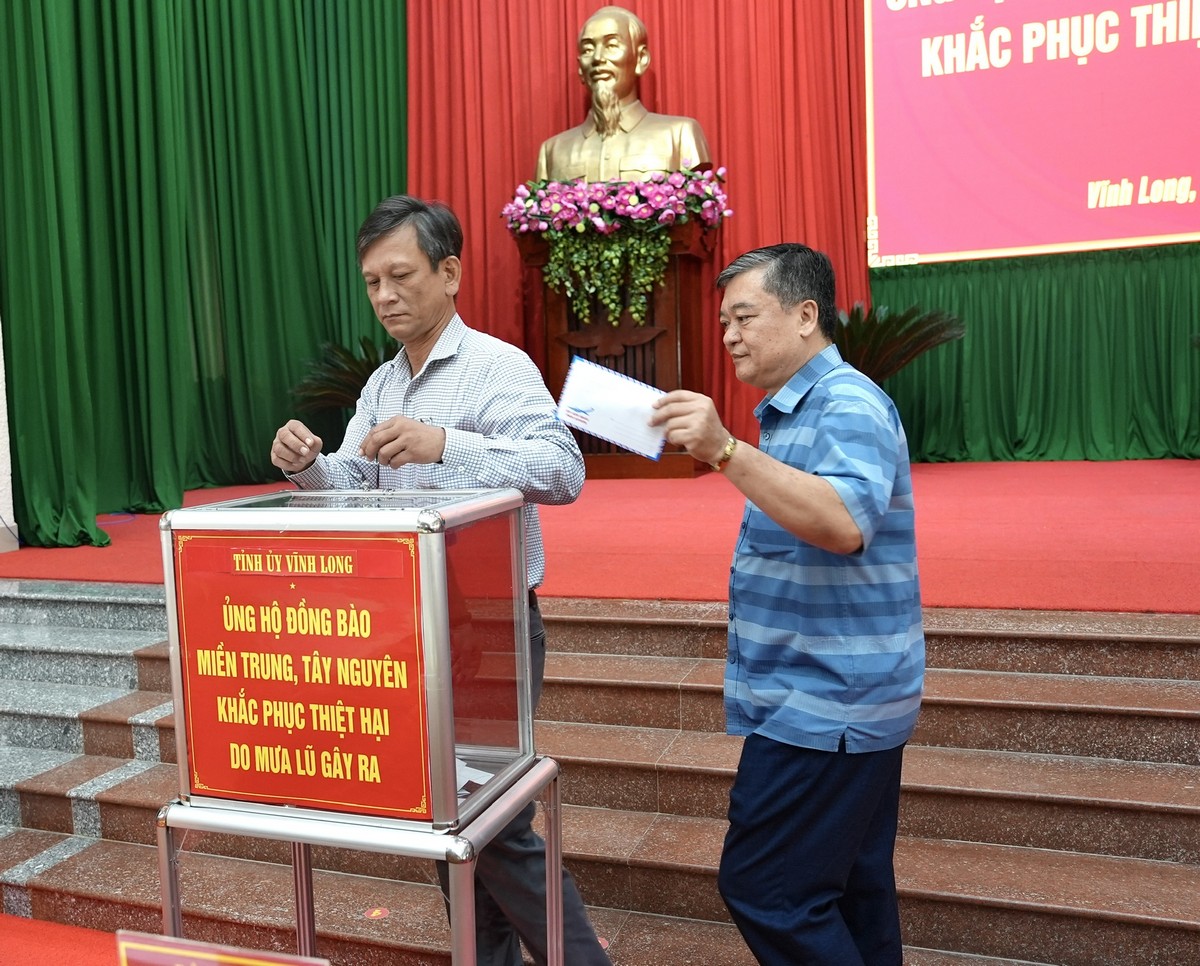 | Ngày 26/11, trước hội nghị quán triệt, triển khai các văn bản của Trung ương về công tác tổ chức xây dựng Đảng, Tỉnh ủy Vĩnh Long tổ chức quyên góp ủng hộ đồng bào miền Trung, Tây Nguyên khắc phục thiệt hại do mưa lũ gây ra.