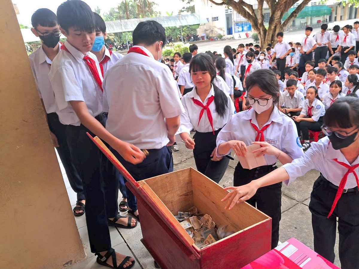| Học sinh Trường THCS Phú Hưng tham gia đóng góp. |
