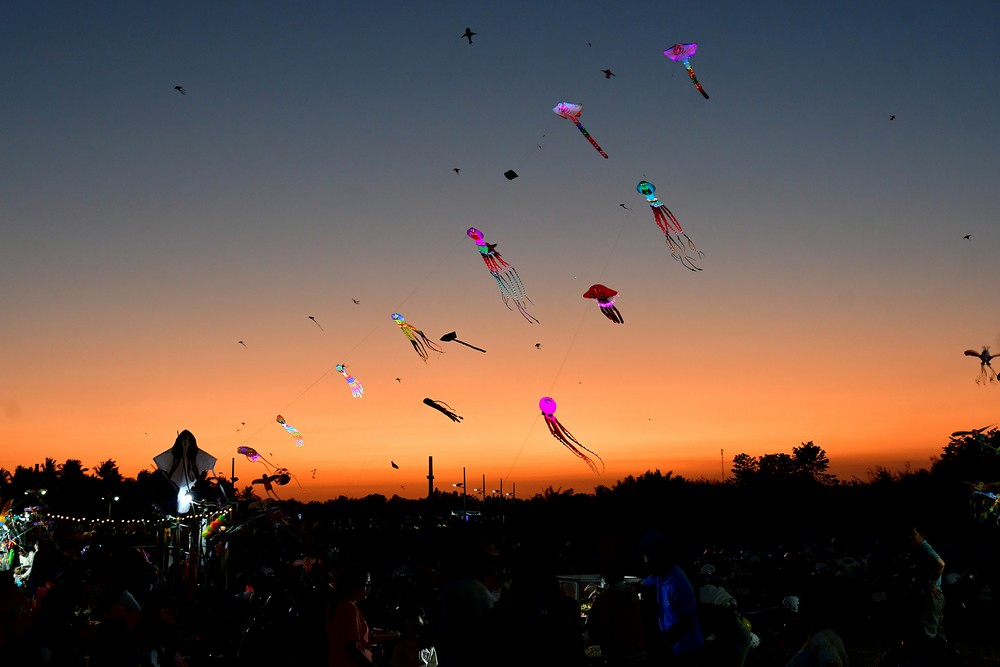 | Hoàng hôn buông xuống cũng là lúc những cánh diều đèn led phát sáng. |