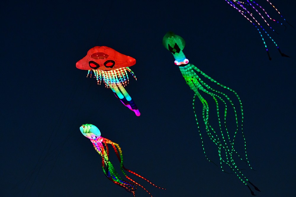 | Hoàng hôn buông xuống cũng là lúc những cánh diều đèn led phát sáng. |