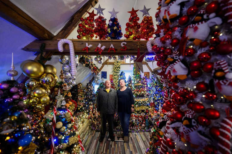 | Susanne và Thomas Jeromin, được Viện Kỷ lục Đức (RID) công nhận kỷ lục thế giới với 621 cây thông Noel trang trí trong một ngôi nhà, chụp ảnh tại phòng khách ở Rinteln, phía tây Hanover (Đức), ngày 4/12/2025 - Ảnh: Reuters |