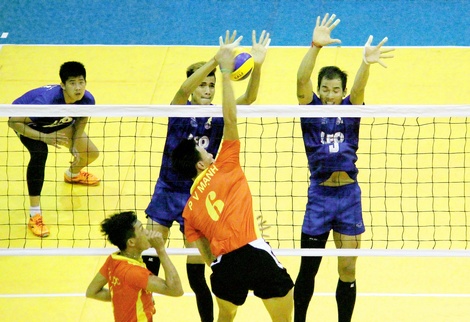 | Pha tranh bóng giữa đội Visakha (Campuchia, áo xanh) trong trận khai mạc gặp đội XSKT Vĩnh Long tại Giải Bóng chuyền quốc tế Arirang 2016. Ảnh: DƯƠNG THU |
