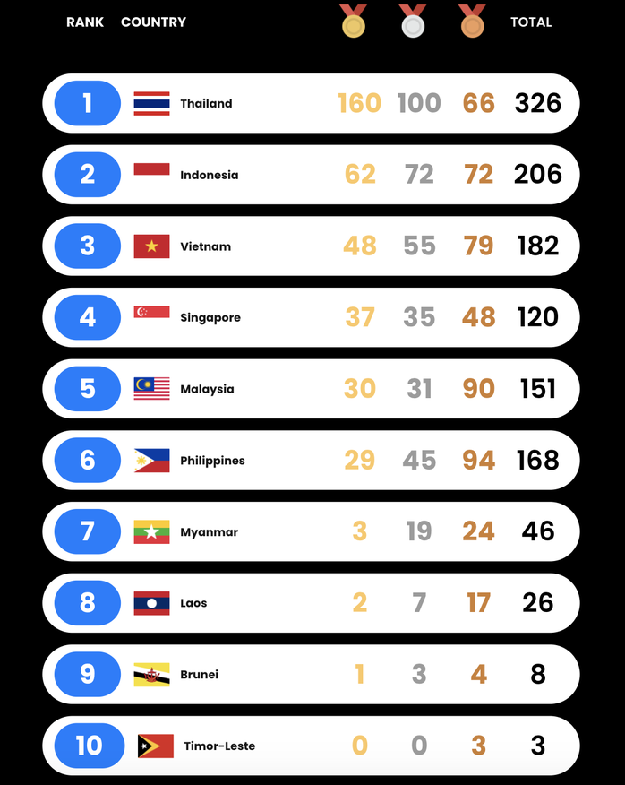 Kết thúc ngày thi đấu chính thức thứ 7 tại SEA Games 33, đoàn Việt Nam củng cố vị trí trong ba đoàn dẫn đầu Đại hội. Trong ngày 16-12, Đoàn Thể thao Việt Nam giành thêm 8 HCV, nâng tổng số HCV sau 7 ngày thi đấu chính thức lên con số 48. Theo bảng tổng sắp huy chương tạm thời, Đoàn Thể thao Việt Nam đứng ở vị trí thứ ba với 174 huy chương, bao gồm 48 HCV, 52 HCB, 74 HCĐ.
