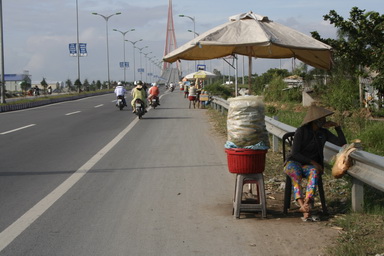 Người mua bán bắp, trái cây lấn chiếm lòng đường trên đường dẫn cầu Cần Thơ gây cản trở giao thông.