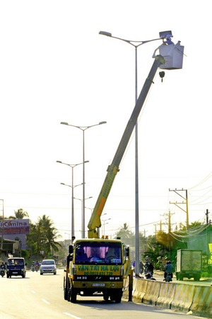 Khẩn trương lắp đặt hệ thống chiều sáng đô thị, làm đẹp đường phố chuẩn bị cho Lễ công bố thành lập TX Bình Minh (Ảnh: Dương Thu)