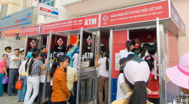 Bên ngoài một số máy ATM nhiều người đợi tới 30 phút vẫn chưa tới lượt.