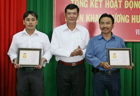 | Ông Huỳnh Bá Long- Tỉnh ủy viên, Chủ tịch Liên đoàn Lao động tỉnh trao bằng lao động sáng tạo của Tổng Liên đoàn Lao động Việt Nam cho 2 cá nhân xuất sắc. |