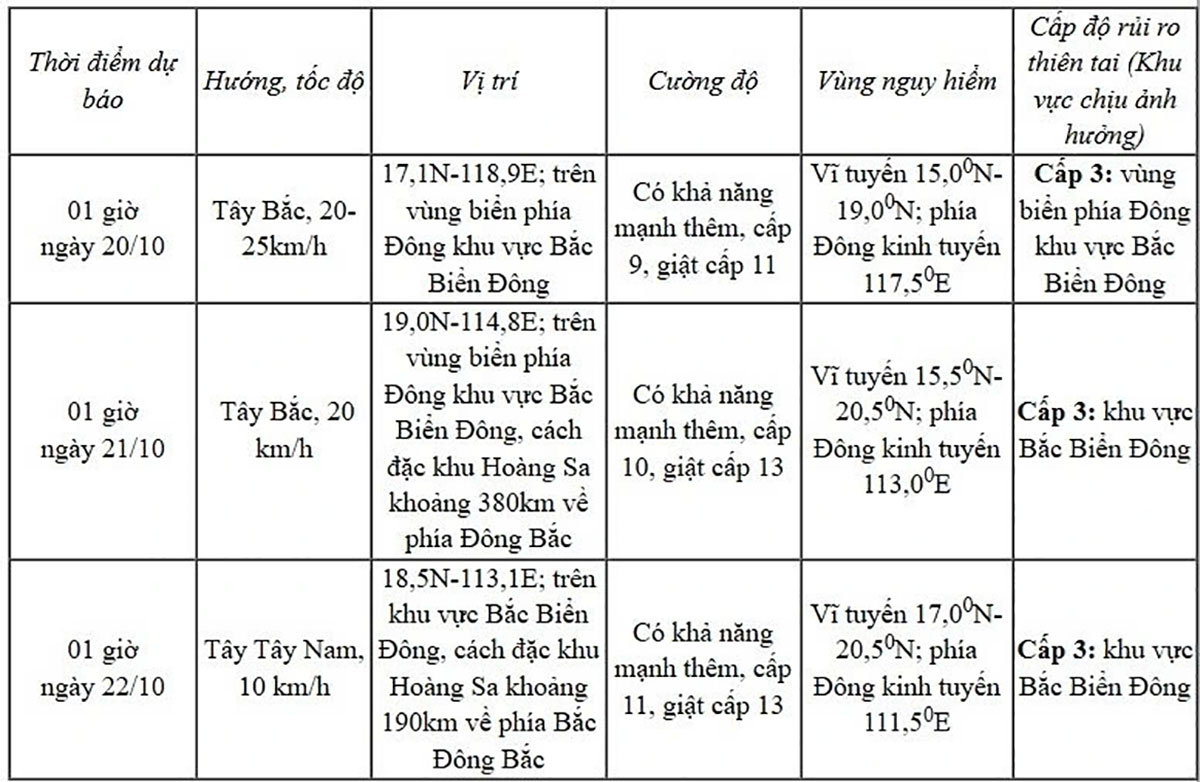 Cảnh báo trong khoảng ngày 20-22/10, khu vực Bắc Biển Đông (bao gồm đặc khu Hoàng Sa) có khả năng chịu tác động của gió mạnh cấp 10-11, giật cấp 13.