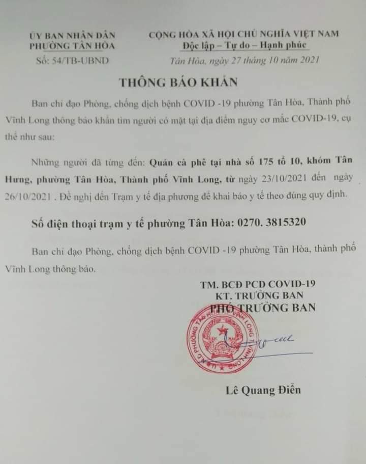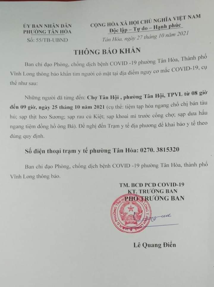Thông báo khẩn của BCĐ Phòng chống dịch COVID-19 phường Tân Hòa (TP Vĩnh Long)