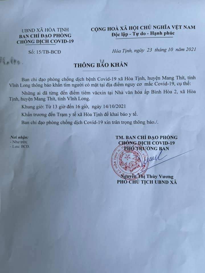Thông báo khẩn của BCĐ Phòng chống dịch COVID-19 xã Hòa Tịnh (Mang Thít)