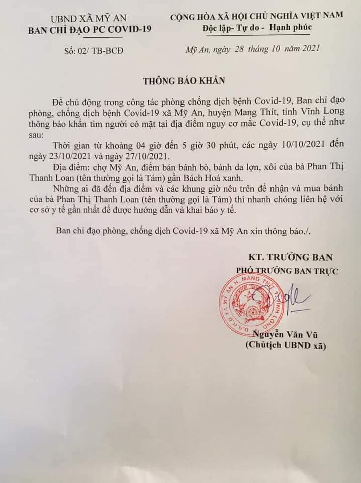 Thông báo khẩn của BCĐ Phòng chống dịch COVID-19 xã Mỹ An ( Mang Thít)