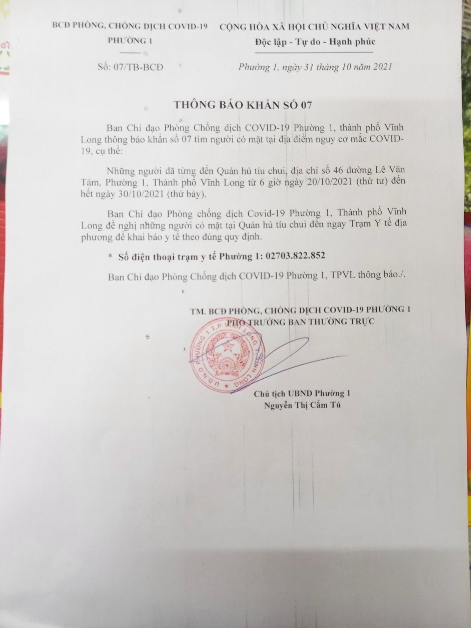 Thông báo khẩn của BCĐ Phòng chống dịch COVID-19 phường 1 (TP Vĩnh Long)