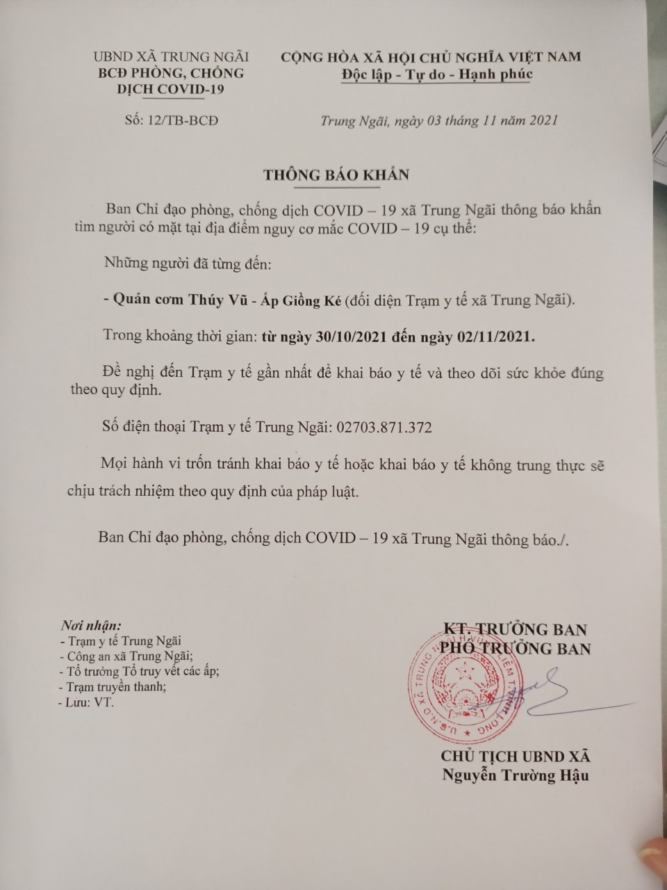 Thông báo khẩn của BCĐ Phòng chống dịch COVID-19 xã Trung Ngãi (Vũng Liêm)
