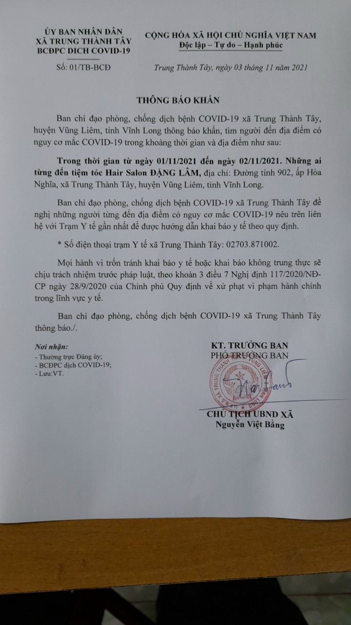 Thông báo khẩn của BCĐ Phòng chống dịch COVID-19 xã Trung Thành Tây