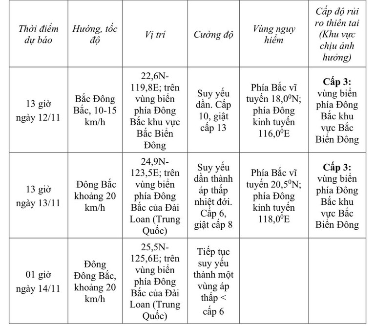 Theo Trung tâm Dự báo khí tượng thủy văn quốc gia, hồi 13 giờ ngày 11/11, vị trí tâm bão số 14 (Fung-Wong) ở vào khoảng 20,0 độ vĩ bắc; 118,4 độ kinh đông, trên vùng biển phía đông khu vực bắc Biển Đông.