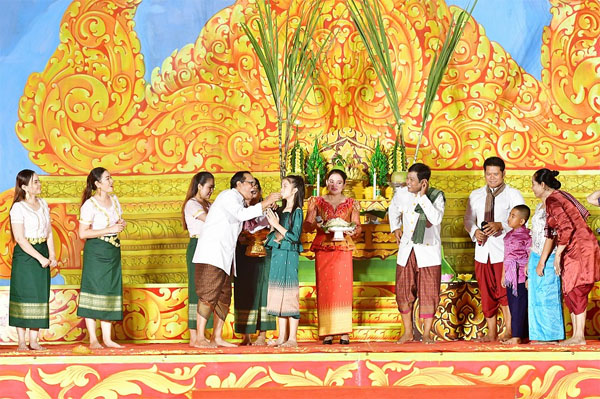 Sân khấu hóa lễ cúng trăng trong đêm hội Ok Om Bok, tái hiện rõ nét nghi thức truyền thống mang đậm bản sắc văn hóa của người dân tộc Khmer. Ảnh: BÁ THI |