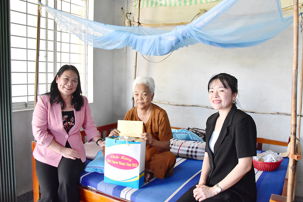 | Phó Chủ tịch UBND tỉnh- Nguyễn Thị Bé Mười chúc Tết và tặng quà gia đình liệt sĩ, Anh hùng lực lượng vũ trang nhân dân Lâm Sắc (xã Đại An). |