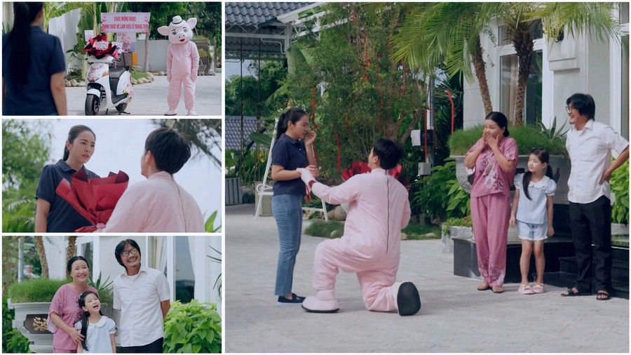 Để ghi điểm, Thái không ngần ngại rũ bỏ hình tượng, chấp nhận cosplay thành một chú heo hồng khổng lồ chỉ để đổi lấy nụ cười của người mình thích. Màn tỏ tình khó đỡ này chắc chắn sẽ khiến khán giả vừa ngỡ ngàng, vừa bật cười vì độ “chịu chơi” hiếm có.