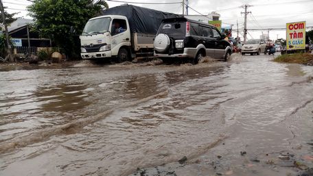 Những chiếc xe tải, xe khách tải trọng lớn chạy vù vù làm tung tóe nước, người đi xe máy loạng choạng điều khiển phương tiện lách vào bờ. Nước đen ngòm, chẳng thể nào phân biệt được đâu là “ổ gà”, đâu là “ổ voi” để tránh.